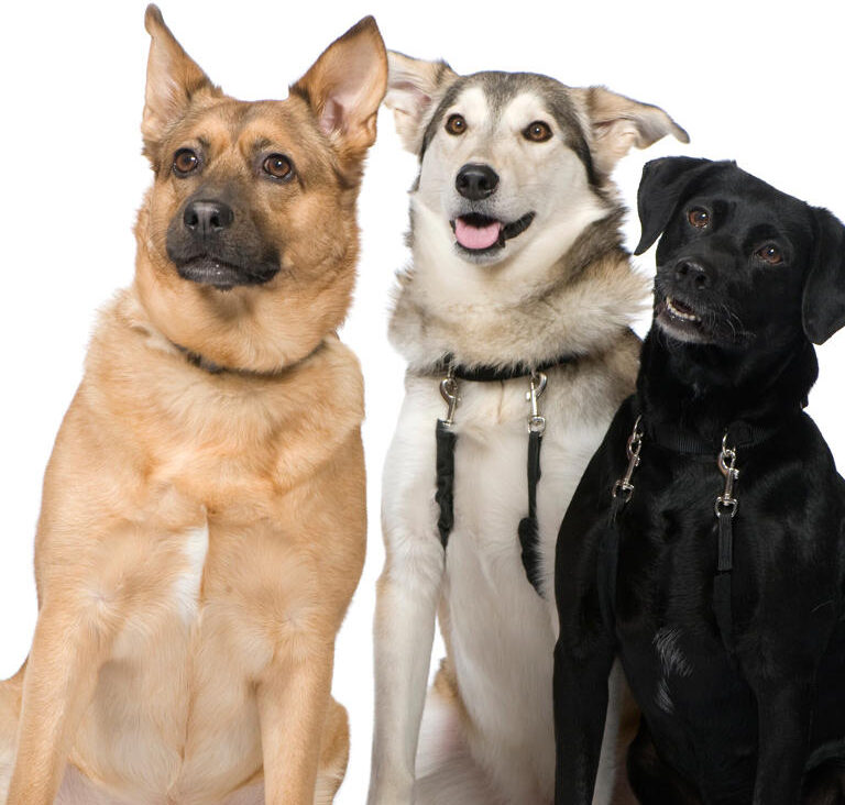 Three crossbreed dogs in front of a white background