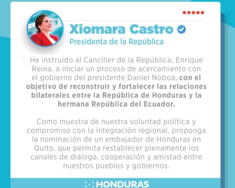 La Presidenta de la República, Xiomara Castro, ha instruido al Canciller Enrique Reina a iniciar un proceso de acercamiento con el gobierno del presidente ecuatoriano Daniel Noboa, con el objetivo de reconstruir y fortalecer las relaciones bilaterales entre Honduras y Ecuador. Según
